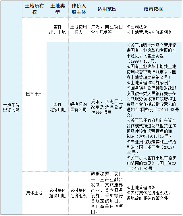 我国现行土地管理制度下,土地根据所有权性质不同,分为国有土地和集体土地;其中,国有土地根据使用权取得方式和权益的不同,又分为国有出让土地和国有划拨土地。根据政策历史沿革及当前政策导向,土地作价入股涉及国有出让土地、国有划拨用地及农村集体建设用地。其中,国有出让土地广泛适用于商业项目的合作开发,国有划拨用地多用于以国家(地方政府)名义、在国企改制过程中的资产处置或限定领域(如公租房、农产品批发市场、养老等其他行业领域)的政府与社会资本合作公益性项目,农村集体建设用地多用于农村集体经济组织自办企业或与其他主体共办企业。详情如下表所示: