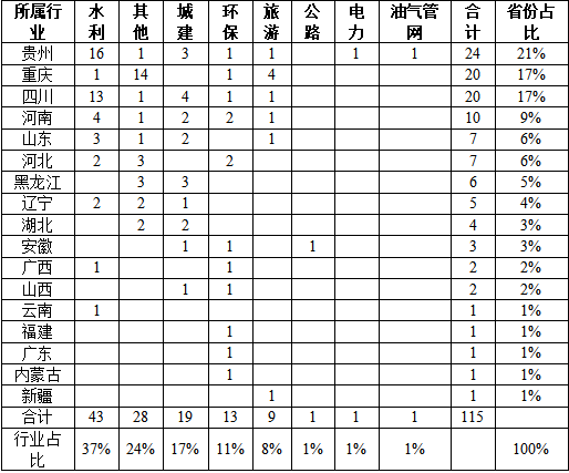 根据国家发改委全国投资项目在线审批监督平台,全国政府和社会资本合作项目信息公开显示,截止2026年2月10日,入库的新机制项目共384个,其中,以TOT为具体实施方式的项目共115个,涉及公路水路港口、城建、水利、环保、旅游、其他(公租房等)、电力、油气管网等行业。其中水利行业占比最高,达37%,其次为其他(公租房等)项目,占比24%;按省份统计,此类盘活存量项目共涉及17个省份,其中贵州省项目数量最多,共24个,占比21%,重庆市与四川省并列第二,各20个,各占比17%,具体情况如表所示: