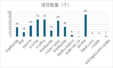 本次专项债券发行十二至十七期中,城市更新领域数量最多,为90个;其次是生态环保和社会事业领域,发债数量均为70个;特殊重大项目及土地储备领域本次暂无项目发行。具体项目发行领域数量分布如下: