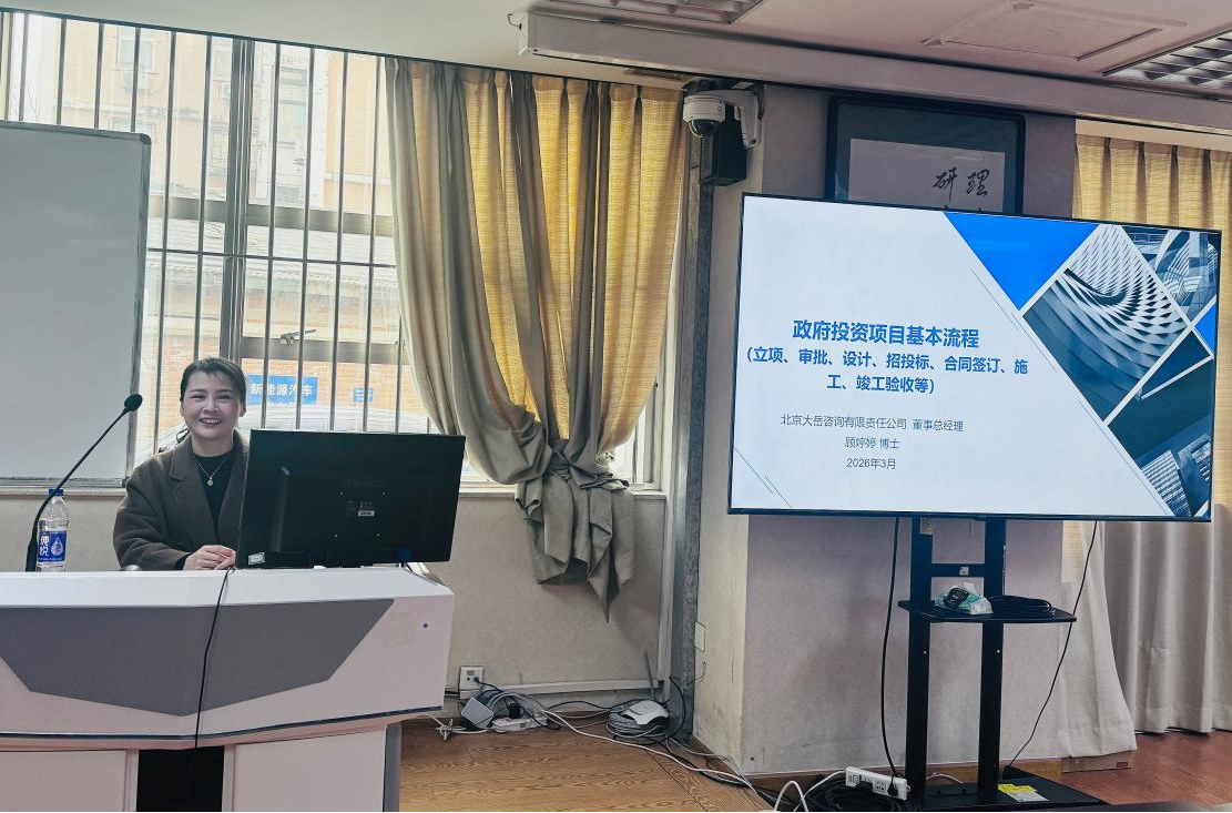 2026年4月2日,大岳咨询董事总经理、行业首席专家顾婷婷博士作为特邀讲师,再次走进中国财政科学研究院(以下简称“财科院”)的课堂,完成本学期她在《PPP项目管理实务》系列课程中的第二次专题讲座。中国财政科学研究院作为财政部直属事业单位,是我国财政领域的重要智库和高级人才培养基地,对授课讲师的专业水平和实务经验有着严格要求。本次系列授课面向财科院2025级硕士研究生,顾婷婷博士通过两次深度教学,以“基础夯实+实务进阶”的双模块教学,系统构建了从传统政府投资到PPP项目的全流程知识体系。