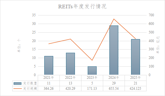 自2021年6月首批基础设施REITs产品在沪深交易所成功上市以来,每年均有REITs产品发行上市,且自2024年项目常态化发行后,发行数量及规模相较于前三年均有较大幅度增长。