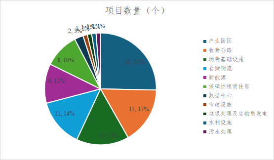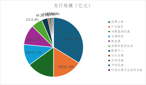 从发行规模看,收费公路类项目占比最大,达到34%;产业园区和消费基础设施紧随其后,占比分别为16%和15%,前三类项目合计发行规模约1320亿元,占总规模的65%。