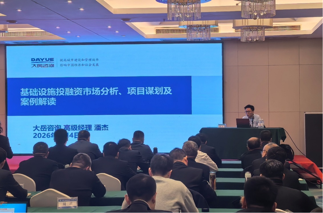 2026年2月4日,大岳咨询受邀为中铁十局投资公司开展专题培训,大岳咨询董事总经理曹福全、高级经理郭新超、朱海航、潘杰受邀参加。本次培训紧密围绕国家及地方最新出台的基础设施投融资政策导向,从向上资金申请、基础设施投融资市场分析、特许经营政策解读、城市更新运作模式等方面做了分享。