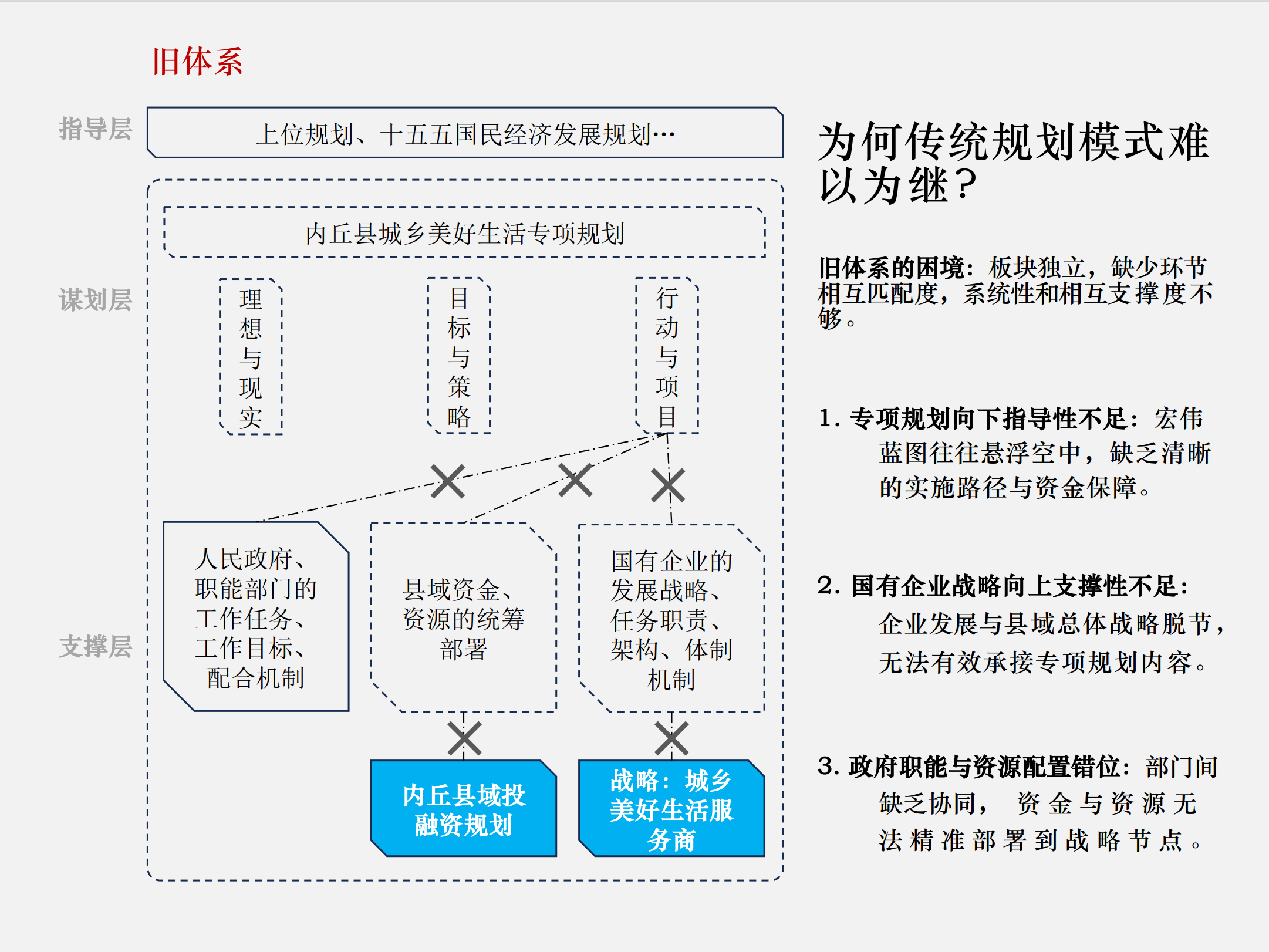 会上,大岳区域总经理王超围绕“城乡美好生活服务商”战略落实展开系统性讲解。针对传统发展模式下存在的规划落地成效不足、资金统筹能力薄弱、部门协同联动不畅、国企对接偏差错位等核心痛点,提出“规划引领-投融资统筹-部门协同-国企承接”一体化驱动转型思路,并解读了项目谋划、板块衔接、权责划分、投融资匹配等关键议题。