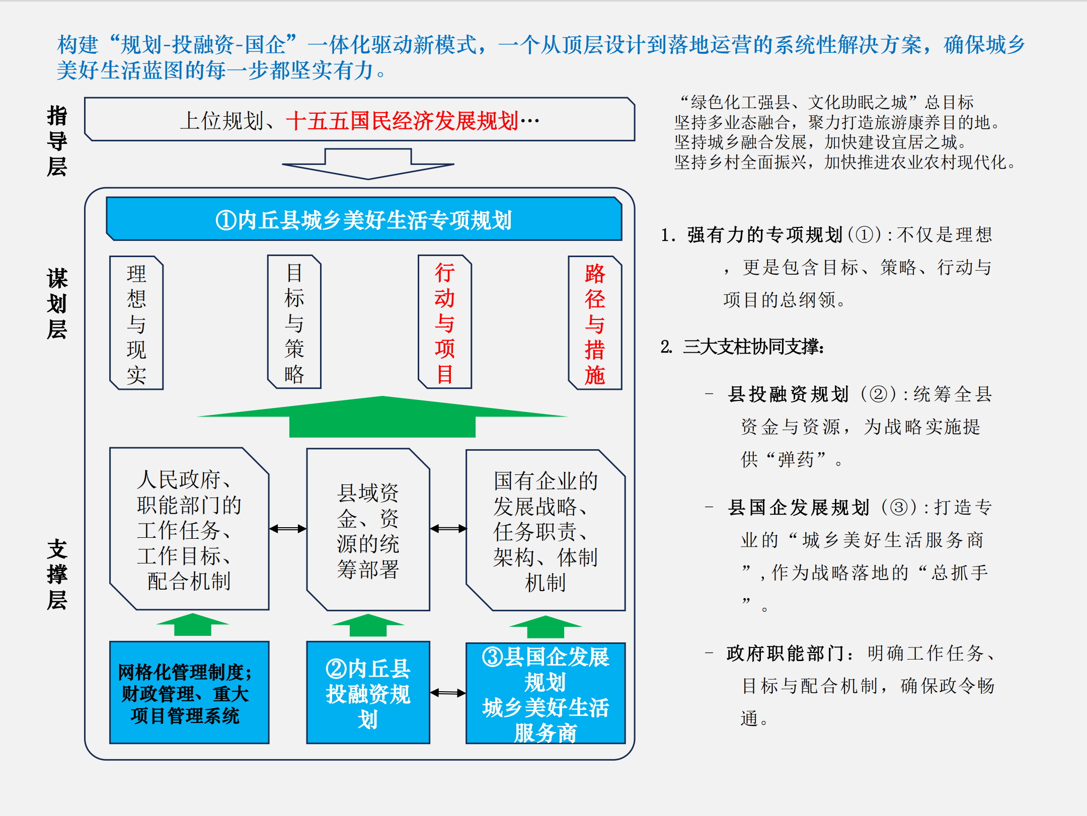 大岳咨询提出的运作思路,创新性地将规划的“谋划力”、投融资规划的“保障力”、部门协同的“统筹力”与国企改革的“执行力”紧密捆绑,形成闭环推进体系,得到了与会领导的广泛认同。基于大岳咨询提出的一体化驱动思路,会议进一步明确了实施路径与关键举措。
