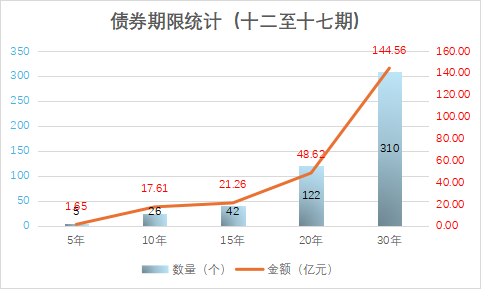 本次发行项目十二至十七期中债券期限包含5年、10年、15年、20年、30年。其中30年长期限项目合计310个,占全部发行项目的61.39%,30年长期限项目也是发行金额最多的,总全部发行金额的61.86%。