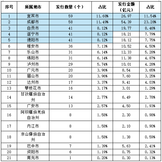 本次专项债券发行十二至十七期中,四川省18个地级市和3个自治州均有项目。其中发行项目数量前五的分别为宜宾市59个、成都市58个、德阳市41个、遂宁市41个、自贡市41个;发行金额前三的分别为成都市54.3930亿元、宜宾市26.9712亿元、自贡市19.7727亿元。具体分布如下表: